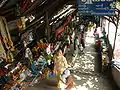 For those who are fit to make the climb, it is considered a rewarding experience and a meritorious deed at the same time. Two gigantic chinthes or leogryphs (stylised lion figures) stand guard at the southern and main approach at the foot of the hill, popularly known as the Chinthe hnakaung atet (two chinthes ascent). It is a gentle climb and there are many stops along the way, most importantly the hermit U Khanti's dazaung or hall where the Peshawar Relics ( three fragments of bone of the Gautama Buddha) were kept from 1923 until after the Second World War when they were moved to a building at the foot of the hill and no longer on display.[2] Leaving U Khanti's dazaung is by way of a tunnel lined by Hnakyeik shissu or the 28 Buddhas of the past and present worlds, or alternatively up a steep flight of steps next to the tunnel. Climbers will see plenty of stalls selling flowers, paper streamers, miniature pennants and umbrellas for the Buddha, and food and refreshment for visitors and pilgrims. All the dazaungs have frieze paintings, most of them from the late Konbaung dynasty period; there is one depicting 'Awizi ngayè (Avici Hell) in gory detail.