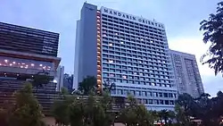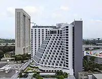 The hotel's 527 rooms and suites overlook the Singapore city skyline.[5] US Architect John Portman designed the atrium-style hotel based on a theatre concept and intended the exterior of the structure to resemble a fan, a nod to the Mandarin Oriental logo.[6][7]