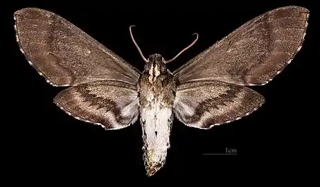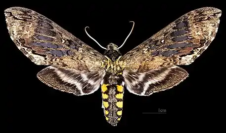 It is similar to Manduca scutata. The primary differences are as follows: it is smaller; the sides of the thorax and upper portion of the head and front wing are more greyish; there are smaller black spots on the underbelly; the black discal patches on the upper portion of the front wing are shorter; there is a broader black median band on the upper portion of the hind wing; and the black lines on the lower side of the hind wing are more prominent.