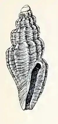 (Original description) The milk white shell contains 6 whorls. The 2½ whorls of the protoconch are dextral, forming a low apex. The first whorl is small and smooth, the second much larger, marked by very slender riblets and fine spiral lirations which increase in strength with the growth of the whorls. The subsequent whorls are very strongly shouldered at about one third of the distance between the sutures anterior to the summit. They are marked by strong, somewhat protractive axial ribs, of which 12 occur upon all but the penultimate whorl. Upon this there are 14. Intercostal spaces are about three times as wide as the ribs. In addition to the axial sculpture the whorls are marked by spiral lirations which are of two strengths. Four of the stronger cross the whorls between the periphery and the shoulder. Of these one is immediately above the suture and one at the angle of the shoulder, the other two divide the space between them into three unequal areas. The space between the peripheral and second strong liration is crossed by four slender subequal spiral threads; that between the second and third also by four, that between the third and fourth by five, of which the middle one is a little stronger than the rest. The space between the shoulder and the summit of the whorls is marked by about 20 slender, equal and equally spaced, spiral threads. The sutures are strongly marked. The periphery of the body whorl is well rounded. The base of the shell is attenuated, marked by strong and fine lirations like the spire, those on the columellar portion being stronger than the rest. There are twelve strong threads having a somewhat variable number of finer threads between them. The entire surface of spire and base is also marked by fine lines of growth which give a pitted appearance to the spaces between the fine spiral fines in the intercostal spaces. All the spirals cross the axial ribs and the coarser ones render their junctions with the ribs slightly nodulose. The aperture is of irregular shape. The outer lip is scythe-shaped, the border of the deep-rounded notch which is immediately below the summit representing the handle, the flattened surface of the strongly in-bent outer lip forming the blade; the surface of the latter is finely, spirally striated. The columellar wall is covered by a thin callus which extends upon the parietal wall.[1]