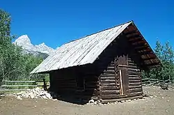 The Manges Cabin in Grand Teton National Park, also known as the Old Elbo Ranch Homestead Cabin, Mangus Cabin and the Taggart Creek Barn, was built in 1911 by James Manges. Manges was the second settler on the west side of the Snake River after Bill Menor, setting up a homestead near Taggart Creek.[2] James Manges (or Mangus) arrived in Jackson Hole in 1910, where he cut wood for Charles or William Wort. Manges' cabin is stated to have been the first two-story structure in the northern part of the valley. A root cellar was excavated beneath. The log and frame structure features wide eaves to keep the winter snow away from the walls. It was heated in winter by a single stove, with one room on each level.[3]