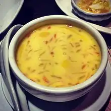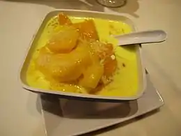 Mango pomelo sago is a type of contemporary Hong Kong dessert. It usually includes diced mango, pomelo, sago, coconut milk, and milk. It can be found in many Chinese restaurants and dessert stores in Hong Kong as well as Singapore, Malaysia, Guangdong, and Taiwan. Over time, this dessert has evolved into many different variations; for example, it can serve as a flavor for other desserts and drinks.[1]