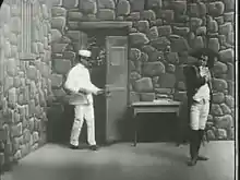 This film is an example of the way in which American production companies were filming remakes of successful films by their competitors. In this case, Edwin Porter, for the Edison Manufacturing Company not only copied the plot of The Escaped Lunatic directed by Wallace McCutcheon for the American Mutoscope and Biograph Company at the end of 1903 and released at the beginning of 1904, but also copied most of the shots. This was regarded as an "ethical equivalent" to the earlier practice of "duping", i.e. making illegal copies of films made by other firms, which had been made impossible with the clarification of copyright law through Court Cases.[2] Porter's film however brings a few new elements, notably more elaborate camera panning in shots 2 and 11, and the use of reverse motion for shot 5 where the characters seem to fly away into a tree. This increases the unreal feeling of the chase and, combined with the fact that when the protagonist comes back to his cell, he finds intact the table that he had previously broken, suggests that the whole chase may have been imagined by the madman.[1]