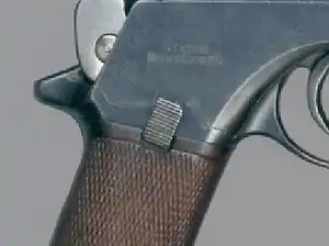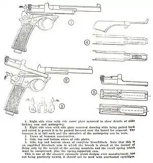 This pistol is one of the most simple of blow-back semi-automatic pistols ever designed. The lockwork is essentially that of an elementary single action revolver. While technically listed as a 'hesitation' lock because of a delaying cam which has some theoretical tendency to slow down the opening of the breech, in actual practice it functions as an unlocked pistol.[1]