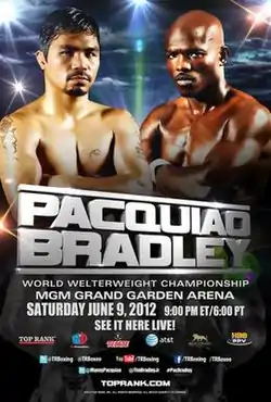 Bradley came into the fight with a somewhat lower profile than a typical Pacquiao opponent. In January 2011, he won a 10th-round technical decision in a junior welterweight title unification bout against Devon Alexander.[4] Previously, he had beaten then world-champion Lamont Peterson to claim the title.[4] After the fight with Alexander, Bradley rejected an offer to fight Amir Khan and further unify the 140-pound division. He signed with Top Rank and was given a co-feature slot on the Pacquiao-Marquez III pay-per-view card in November. In his match, Bradley beat former lightweight champion Joel Casamayor in an eight-round fight.[6]
