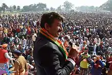 Manoj Tiwari (born 1 February 1971)[2] is an Indian politician, singer and actor serving as a Member of Parliament from North East Delhi. He contested the 2009 general election as a Samajwadi Party candidate from Gorakhpur Lok Sabha but lost to Yogi Adityanath. Again, he contested 2014 Indian general elections as a Bharatiya Janata Party (BJP) candidate and won. He was appointed as Delhi BJP president in 2016.[3] He was the head of the BJP organisation in Delhi when the party recorded a record victory in 2017 MCD elections.[4] He was a contestant in Bigg Boss season 4.[5]