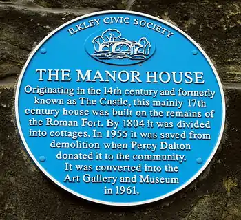 The Manor House building is of historic interest.[7] The building stands on a Roman fort. This is the oldest dwelling-house in Ilkley and was built along with the parish church on the fort Olicana. The church was built in Anglo-Saxon times on top of the Principia or headquarters building of the fort. The Manor House was built into the west defences: that is, it was incorporated with part of the free-standing defensive west wall of the fort, and many robbed-out Roman small squared stone blocks are now part of the building.