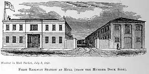 The station was constructed as the original Hull terminus of the Hull and Selby Railway. The station was located on a site of around 5 acres (2.0 ha) adjacent to the Humber Dock and Kingston Street. The main building was a two-storey structure of white brick and stone, known as Railway Office, was constructed facing onto Humber Dock. The office was 100 by 70 feet (30 by 21 m) deep by wide with waiting rooms, and ticket and parcel offices on the ground floor; a passage led from the station front to the train shed behind; the first floor contained the company offices including the director's room.[1][2] The design is thought to be by James Walker and John Timperley, with Simminson & Hutchinson as the building contractors, ironwork by James Young.[3]