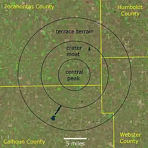 No surface evidence exists due to comparatively recent coverage by glacial till, and the site where the crater lies buried is now a flat landscape. But, hidden about 20 to 90 m (66 to 295 ft) below the surface is a buried structure about 38 km (24 mi) in diameter. It lies under the southeast corner of Pocahontas County and extends under portions of three adjoining counties. That an anomalous structure underlaid the area was known from unusual water well drill cuttings in 1912 of deformed rock, "crystalline clast breccia with a melt matrix" as a later report described it.[5] A research investigation was started in 1955, and it was labeled a "cryptovolcanic structure" (a hypothetical volcanic steam explosion). Further investigation was undertaken by Robert S. Dietz who proposed an impact origin in 1959 and by Nicholas Short in 1966 who produced evidence of shocked quartz grains which confirmed the impact origin of the structure.