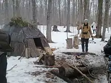 Maize comprised 62% of the community's diet, which translates to approximately one pound of maize per person per day, or (minimally) 1,500 pounds for the community per day. More maize may have been required for trade with the Algonquin people to the north. The community farmed 80 square kilometres of land, stretching up to five kilometres in every direction from the village site.[8] For clothing approximately 7000 deer hides per year were needed, which would have required hunting about 40 kilometres in every direction from the site.[9]