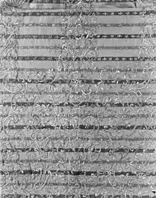 In addition to the striped fabric and its small embroidered motifs, the lower part of the petticoat, to about knee-height, is decorated with an elaborate scrolling design in silver-gilt thread that suggests gold lace. The pattern is similar to lace panels of the period, and is strictly symmetrical, in keeping with the taste of the late Baroque.[4]