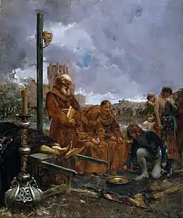 While studying there, he became a regular participant in the National Exhibition of Fine Arts, presenting two paintings in 1876 and six in 1878, receiving a Third Class prize for his depiction of the death of Francisco Pizarro, based on a version of that event by the poet, Manuel José Quintana.[1] That work was also presented at the Exposition Universelle.