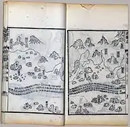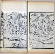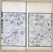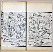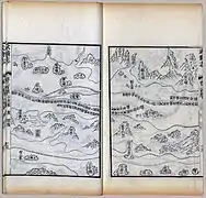 The map was originally in the form of a strip map of 20.5 cm by 560 cm that could be rolled up, but was then divided into 40 pages in the book. The map, after Nanjing and the Yangtze River, shows mainly the coastal regions and islands along the sea route, and places are depicted in their approximate positions along the contour of the coast. The coast of the main land mass is shown largely as a continuous irregular line at the top of the map, with deep V-shaped indentations indicating river estuaries. As a result of the nature of the map and its focus on the coastal region, the shape of the Malay Peninsula cannot be distinguished, and India became elongated as its interior is omitted. Pages of the map are arranged from right to left in traditional Chinese book format, starting from Nanjing and finishing in Hormuz.[1] Places in East Africa such as Socotra, Mogadishu and Malindi appear in sequence from left to right on the coast of Africa which is shown as a continuous land mass at the bottom of the sections for India and Sri Lanka.[11]