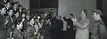 c) Mao Zedong: "....... Chiang Kai-shek was the first person who taught me to fight, and that means this time. Once we fought, we fought for ten years. We grew from no army to an army of 300,000 men, and I ended up making my own mistakes, which cannot be blamed on Chiang Kai-shek. We lost all our southern bases and had to carry out the 25,000-mile Long March. Here, there is me, and (my) comrade Liao Chengzhi. How many troops were left? It was reduced from 300,000 to 25,000. Why should we thank the Imperial Japanese Army? It was the Japanese Imperial Army that came, and we fought the Japanese Imperial Army before we cooperated with Chiang Kai-shek again. After eight years of fighting with 25,000 troops, we have grown to 1.2 million troops and a base area of 100 million people. Do you say be thankful?"[15]
