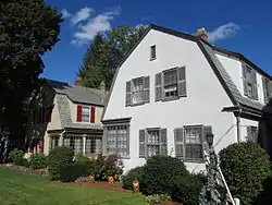 The Maple Street properties are ten nearly identical wood-framed gambrel-roofed Colonial Revival (Dutch Colonial) cottages, which the company intended as housing for its foremen. All are oriented with a gable end to the street, with the main entrances of the houses on the sides, facing each other in pairs. Nominally 1+1⁄2 stories tall, they feature long dormers in their roof line that create a full second story inside. All feature a slate roof, stucco exterior, and an enclosed porch. The design work for them was done by Loring & Leland of Boston, who are known to have designed other worker housing areas.[2]