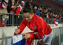 María José Alondra Rojas Pino 'Cote Rojas' (born 17 December 1987) is a Chilean professional footballer and is one of the top figures and one of the most outstanding players of the Chilean National women's soccer team (The La Roja).[4][5] Rojas a 13-year veteran of the La Roja, remains one of the highest scoring strikers with 11 international goals in 44 international games.[6][7]