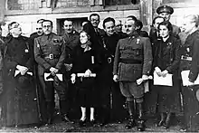 In late April called to Salamanca and received by Franco,[99] she entered Sección Femenina of the newly created state party and along Pilar Primo de Rivera and Mercedes Sanz Bachiller became one of its leaders. Urraca assumed management of Delegación Nacional de Frentes y Hospitales,[100] one of three branches of the Sección[101] and entrusted with catering for the wounded. In FET she emerged as one of 3 Carlists among 14 heads of all Delegaciones. In October 1937 she was appointed - as one of 12 Carlists[102] - to the newly established, 50-member Consejo Nacional,[103] which triggered her expulsion from Comunión Tradicionalista.[104] Engaged in organization and propaganda work, she kept visiting frontlines[105] and was fêted along Nationalist heroes like Moscardó.[106] Paradoxically, in the Republican media Urraca enjoyed no lesser popularity than in the Nationalist ones, mocked and ridiculed by the enemy press.[107]