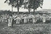 Following organizational shakeup of the party executive in 1934, the new leader Manuel Fal entrusted her with re-modeling the Secciones Femeninas of Comunión Tradicionalista.[76] Female groupings, known as Margaritas, operated as affiliated with local circulos; apart from boosting membership and launching new activities, Urraca was entrusted with turning the organization from very loose federation into a nationwide structure; since the task has never been fully completed she did not assume formal presidency,[77] though some scholars name her de facto leader.[78] Up to 1936 Margaritas recruited 23,000 women,[79] mostly in Valencia, Navarre and Vascongadas.[80] Urraca encouraged them to take courses in nursing (and took it herself),[81] getting ready to the anticipated violent overthrow of the Republic. In 1936 she unsuccessfully run for the parliament again, this time from Teruel.[82] Urraca continued her favorite social activities setting up Socorro Blanco, the Carlist relief organization.[83] In the movement's press she campaigned for Spiritual Crusade of Prayer.[84] In April 1936 she was detained for illegal possession of a pistol[85] but was smuggled out of custody and spent the last few months of peace hiding in a village of Arcos de la Llana near Burgos.[86]