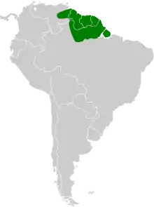 The nominate subspecies of Marail guan is found from eastern Venezuela through the Guianas. P. m. jacupeba is found in northern Brazil north of the Amazon River and possibly in southeastern Venezuela, although not all authorities accept the latter.[2][3] It mostly inhabits mature tropical forest though it can be found in secondary forest. In the Guianas and Brazil is favors terre firma forest with dense undergrowth. It is a bird of the lowlands, in Venezuela ranging between 100 and 600 m (330 and 1,970 ft) of elevation.[3]