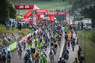 The race is divided into three courses of varying difficulty: the Sellaronda course, the Middle course and the Maratona course. All riders start at 6:30 am in the village of La Ila and complete the four pass Sellaronda course first. After completing the Sellaronda course riders can either choose to finish the race or proceed directly onwards with the Middle course. As the Maratona course is an extension of the preceding shorter Middle course, riders doing the full Maratona dles Dolomites have to proceed with the Middle course.[3] All three courses go through the Dolomite mountains around the Sella Group and over roads, the Giro d'Italia have taken place. The roads are lined with thousands of spectators and the event is broadcast live on Italian national broadcaster RAI.[1][4] Along the courses seven refreshment stations are manned by volunteers, with foods and drinks, varying from sports drink to coffee to Strudel or Speck sandwiches.