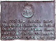 An account told by a Ngāpuhi informant to John White (ethnographer 1826–1891), but not published until 1965, describes the chiefs Te Kauri and Tohitapu as participating in the massacre when Marion and 26 men of his crew were killed and cannibalised.[13] Apparently tapu had been placed on Manawaora Bay after members of the local tribe drowned here some time earlier, and their bodies had been washed up at Tacoury's (Te Kauri's) Cove – therefore, the local Māori believed that the violation would anger the gods and neighbouring tribes, provoking war.[13]
