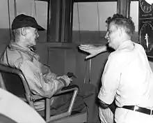 Mitscher was considered to be a very quiet man. He rarely spoke, never engaged in small talk and would never discuss mission details at the mess table. On the rare occasions when he would enter into conversation it would be about fishing, the love of which he picked up in his middle years.[47] Mitscher relaxed by reading cheap murder mysteries, and when at sea he would always have one with him.[48] Though he appeared distant and severe to those who did not know him, in truth he held a deep affection for his men and possessed a dry sense of humor. An example of his humor was displayed in his gentle ribbing of his chief-of-staff, Captain Arleigh Burke. Burke had come to Mitscher from destroyers, and it was well known that he preferred a fighting command over his new role as chief-of-staff. When a destroyer came alongside to refuel from their flagship, a carrier, the admiral directed a Marine sentry nearby: "Secure Captain Burke, till that destroyer casts off."[49]