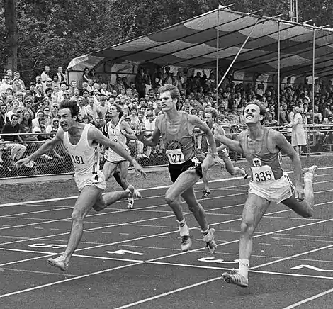 ![]() Finish of the Dutch 200 m championships in 1982. Left-right: Mario Westbroek (winner), Henk Brouwer and Marcel Klarenbeek | |