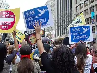 ANSWER Coalition is largely accredited with being responsible for many of the recent United States-based anti-war protests.[11] Formed in the wake of the September 11th attacks, ANSWER has since helped to organize many of the largest anti-war demonstrations in the United States, including demonstrations of hundreds of thousands against the Iraq War.[11][12] Though its national headquarters are in Washington, D.C., where it organizes its national antiwar demonstrations, the coalition's influence is seen as being perhaps strongest in San Francisco, and increasingly, in Los Angeles. ANSWER has faced criticism from other anti-war groups for its affiliations as well as its tactics at demonstrations as well as charges of antisemitic sentiments expressed by some demonstrators at its protests.[13] Michael Albert and Stephen R. Shalom writing in Z argue that most people at a "...demonstration will in fact be unaware of exactly who said what and whether any particular speaker omitted this or that point."[14] The longer-term effects of these concerns may also play into declining numbers at protest events.