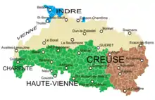 The range area does not coincide with the historical province of La Marche but it is larger than that,.[26][27] Marchois is spoken in the north of Creuse,[28][29][30][31] and Haute-Vienne to which must be added the north of the Charente Limousine around Confolens, some southern communes of Poitou[32] but also the south of Boischaut, at the southern tip of Berry in the southern parts of Indre[33] and Cher (Saint-Benoît-du-Sault,[34] Lourdoueix-Saint-Michel,[35][36] Culan), and finally Montluçon and its region in the Allier (Châtaigneraie),[37][38],.[39]