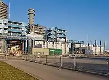 Marchwood Power Station is next to Southampton Water on Marchwood Industrial Estate.[1] It is a combined cycle gas turbine (CCGT) power station.[1] The plant uses compressed air and gas to power one turbine and then uses exhaust gases from that process to boil water and power a steam turbine.[2] The power station generates 898.1MW of electricity.[2] Water from the River Test is used as part of the cooling process.[2] Around 45 people work at the power plant.[2]