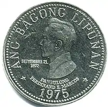 From 1975 to 1982, the Bangko Sentral ng Pilipinas (BSP) introduced a five peso coin in line with the new 'Ang Bagong Lipunan' series issued in commemoration of Marcos's declaration of Martial Law. The obverse bears the inscription 'Ang Bagong Lipunan,' year of minting, and a profile of Marcos, who was the president throughout the circulation of the coins, faced to the left. Marcos himself approved the coins with his own face. The denomination, the inscription 'Republika ng Pilipinas', and the official coat of arms are all on the reverse.[130] The coin along with the other denominations of the Ang Bagong Lipunan Series were demonetized by the BSP on January 2, 1998.