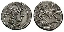 Denarius of Marcus Servilius, circa 100 BC. On the obverse is Roma. The reverse shows the duellists on foot, with their horses in the background.[11]