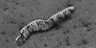 Sand dunes have been found in many places on Mars. The presence of dunes shows that the planet has an atmosphere with wind, for dunes require wind to pile up the sand. Most dunes on Mars are black because of the weathering of the volcanic rock basalt.[19][7] Black sand can be found on Earth on Hawaii and on some tropical South Pacific islands.[20] Sand is common on Mars due to the old age of the surface that has allowed rocks to erode into sand. Dunes on Mars have been observed to move many meters.[21][22] In this process, sand moves up the windward side and then falls down the leeward side of the dune, thus caused the dune to go toward the leeward side (or slip face).[23] When images are enlarged, some dunes on Mars display ripples on their surfaces.[24] These are caused by sand grains rolling and bouncing up the windward surface of a dune. The bouncing grains tend to land on the windward side of each ripple. The grains do not bounce very high so it does not take much to stop them.