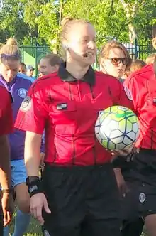 She was selected as a match official for the 2015 FIFA Women's World Cup.[1][2] She was previously a FIFA international assistant referee in 2007 and 2008, and worked the 2010 and 2014 FIFA U-20 Women's World Cups.[3] She also worked the 2012 Algarve Cup championship.[4] Domka was formerly an NCAA Division III All-American at University of Wisconsin–Stevens Point.[5]