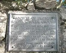 In late June 1652, George Fox visited Swarthmoor Hall. Margaret Fell met him, and later wrote that he "opened us a book that we had never read in, nor indeed had never heard that it was our duty to read in it (to wit) the Light of Christ in our consciences, our minds never being turned towards it before."[4] A day or two later it was lecture day at the parish church, she invited Fox to attend with them; he came in after the singing and asked for liberty to speak. Over the next weeks she and many of her household became convinced.[5] Over the next six years, Swarthmoor Hall became a centre of Quaker activity; she served as an unofficial secretary for the new movement, receiving and forwarding letters from roving missionaries, and occasionally passing along admonitions to them from Fox, Richard Hubberthorne, James Nayler, and others. She wrote many epistles herself and collected and disbursed funds for those on missions. After her husband's death in 1658, she retained control of Swarthmoor Hall, which remained a meeting place and haven from persecution, though sometimes, in the 1660s, raided by government forces.