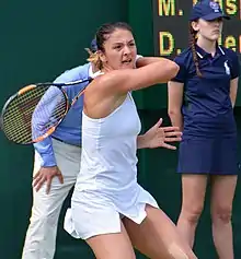 Gasparyan returned stronger during the grass-court season, upsetting 7th seed Viktória Kužmová in the first round of the Rosmalen Grass Court Championships despite being two points away from defeat.[26] She then stunned Elina Svitolina for her first Top 10 win of the year at the Birmingham Classic.[27] At Wimbledon, she was close to repeating her victory over Svitolina in the second round but was hampered by cramps and was forced to retire in the second set despite leading.[28]
