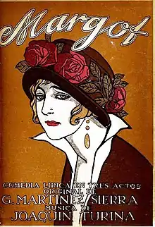 Margot was the second of Turina's three operas, and the first to be staged.[lower-alpha 1] He began its composition on 24 June 1914 and finished the orchestration on 27 September, less than three weeks before the opera's premiere. His librettist, María Lejárraga (writing as was customary for her, under the name of her husband Gregorio Martínez Sierra) had recently written the libretto for José María Usandizaga's Las golondrinas ("The Swallows"), which had premiered in Madrid in February 1914. She would later write the libretto for Turina's third opera, Jardín de oriente ("Oriental Garden").[1][2]