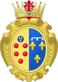 Marguerite Louise and Cosimo greeted each other with indifference, and, according to Sophia, Electress of Hanover, they only slept together once a week.[10] Marguerite Louise, two days after their marriage, demanded possession of the Tuscan crown jewels from Cosimo, who replied that he did not have the authority to give them.[11] The jewels that she did manage to get from Cosimo she tried to smuggle out of Tuscany, only to be stopped by the Grand Duke.[11] Marguerite Louise's indifference, after this incident, turned to hatred, compounded by her continued love for Charles of Lorraine, from whom she was forced to part at Marseilles.[12] On one occasion, she threatened to break a bottle over Cosimo's head if he did not leave her chamber.[9] Her hatred of Cosimo, however, did not prevent their doing their mutual duty by having children: Grand Prince Ferdinando in 1663, Anna Maria Luisa in 1667 and Gian Gastone in 1671.
