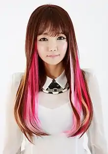In 2011, she was invited to collaborate with girl group 2NE1 on the music video for their song "Hate You" and album 2NE1, after the CEO of YG Entertainment purchased some of her paintings at an art exhibit.[2] She worked on the planning process of the album and provided the artwork for the album cover.[2][11] She produced and directed the animated music video for "Hate You", which depicts the members of the group carrying guns and saving the world from a monster, with her signature huge eyes and thick makeup.[2][4][11][12]