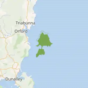 The island has been identified by BirdLife International as an Important Bird Area (IBA) because it supports significant numbers of endangered swift parrots and forty-spotted pardalotes, over 1% of the world population of Pacific gulls, as well as populations of most of Tasmania's endemic bird species.[1] Cape Barren geese are common on the island, as are eastern grey kangaroos, eastern bettongs and other marsupials. Common wombats can be seen almost anywhere. Tasmania's three species of snake are all found on the island: the tiger snake, lowland copperhead and white-lipped snake.