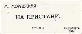At early 1914 first almanac of poems by Moravskaya named "На пристани" (On the Pier) had been issued. Expert in literature Razumnik Ivanov-Razumnik several months before publication of this almanac had sent draft of it to his authoritative colleagues include Andrei Bely and Valery Bryusov.[2] The last by Razumnik's request had written a preface named "Объективность и субъективность в поэзии" (The Objectivity and The Subjectivity in Poetry) for Maravskaya's almanac. But that preface remained unpublished as Moravskaya insisted on; she wrote to Bryusov: