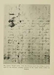 However, the digitized copy belonging to the Rufus A. Long Digital Archive of Cryptology[4] has notations made by other specialists in cryptanalisis, like William F. Friedman, or Charles J. Mendelsohn. There are several notations made in this particular chapter, most of them belonging to A. J. M. Grail, in charge of secret ink section, Captain, MID, Washington, during World War. In those notations, made by Grail, it's stated that "Victorica was quite harmless. She accomplished nothing. She arrived here 22, Jan, 1917 and was arrested 21 April 1918.", that "The plot (of introducing explosives into holy figures) was suggested to Victorica not by her", that she wasn't from a noble origin, but rather a Junker, and finally that "I believe Victorica gave our people in N.Y.C. much information (...), she did not give much accurate information, perhaps out of ignorance." Charles J. Mendelsohn, in charge of German diplomatic code solving section, MID, Washington, also added at the end of the chapter that "It is my impression that Victorica was captured by the Dept. of Justice, plus that the cipher stuff came as a consequence of the capture, not the capture as a consequence of the cipher stuff. V. Weiskopf could throw light on this."