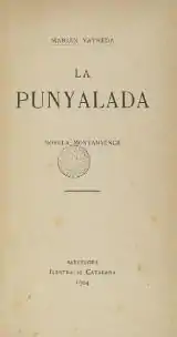 La Punyalada[151] was published posthumously in 1904; though probably missing final touch of the author,[152] it is widely considered his best work which gained Vayreda prominent place in history of the Catalan literature;[153] the novel itself is acclaimed as one of the best works ever written in Catalan.[154] Set in the early 1840s it tells a rural love story against the background of Alt Garrotxa life troubled by local bandits, the trabucaires.[155] It was originally classified as "novela ferrena",[156] "novela objectiva"[157] or "novela historica",[158] though currently scholars focus rather on psychological dimension[159] and ideological undertones;[160] they note exceptional quality of personalities,[161] intriguing narrative technique,[162] putting nature as a protagonist[163] and efficient use of symbols.[164] Though some scholars claim that apparent absence of politics and ideology is sort of credo itself,[165] others maintain that Punyalada contains a veiled political discourse, with one protagonist representing the evil side of Carlism and another one its attractive face.[166]
