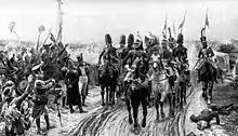 The term did not find immediate use in works of art and literature. Even when depicting conscripts of the Napoleonic Era artists of the Bourbon Restoration such as Nicolas Toussaint Charlet and Auguste Raffet do not use the term. Indeed, the conscripts are not a popular subject for art of the time. This may have been because their simple uniform of hat, cape and musket was not visually appealing. one of the few pre-1870 depictions may be in Ernest Meissonier's 1864 Campagne de France, 1814 which may depict a column of conscripts in the background. Adolphe Lalauze's Le retour des dragons de l'armée d'Espagne ("the return of the dragoons from the Army of Spain") shows a group of Marie-Louises welcoming the cavalry recalled by Napoleon from Spain to the army in France. Depictions of the Marie-Louises in art increased after 1870 as the Franco-Prussian War inspired artists to draw upon the spirit of 1814. The first work of art to be named after the Marie-Louises was Pierre Victor Robiquet's Les Maries-Louises à Champaubert showing a unit of conscripts in square facing Russian cossacks at the 10 February 1814 Battle of Champaubert.[1]