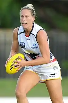 Prior to taking up Australian rules football, Rajcic had had previously played soccer with Adelaide United in the Australian W-League.[2] Prior to that she had played fully professionally for Gustafs GoIF in the Elitettan for the 2012 season,[3][4] and played for Box Hill United in the Victorian Women's Premier League when she returned to soccer after knee surgery.[5][6] She considers captaining Adelaide United in 2015 the best achievement in her soccer career.[7]