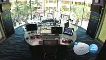 The studio is considered to be the first of its own in the Middle East, The studio is located on the second floor of the mall, with a view to the ground floor where it's easy to see the mall visitors which creates a unique atmosphere compared to the closed studios. It was designed in a modern style equipped with the newest radio techniques in addition to video cameras distributed around the studio to deliver it all on MarinaTV.