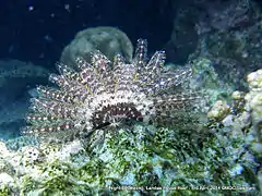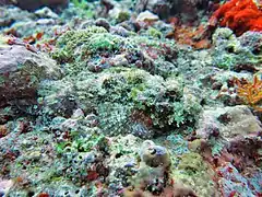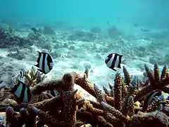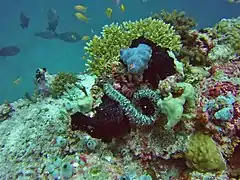 The ecosystem is characterized by a very high rate of coral cover, highly diverse and dominated by table, digitate and branched corals of the genus Acropora. The shallow waters of this atoll and its particular richness in corals and fish have made it a destination for underwater tourism.[1] The presence of huge animals such as manta rays and whale sharks add spectacular encounters to the beauty of the place.[3] Scientific studies suggest that the faunistic composition can vary greatly between neighbor atolls, especially in terms of benthic fauna.[4]
