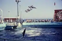 While still in operation, the park was prominently featured in several television shows, including two episodes of The Beverly Hillbillies, The Munsters, The Partridge Family, Mutual of Omaha's Wild Kingdom, Hart to Hart, The Six Million Dollar Man, Emergency!, The Colbys, Wonder Woman, Sea Hunt, and later, Simon & Simon and an A Team episode a year before the park closed.[8] Two episodes of The Chevy Show were taped there with Roy Rogers and Dale Evans featuring an "Aquarodeo" on May 1, 1960 and January 15, 1961. In an episode of the Lucy Show, Lucille Ball falls into a Marineland animal exhibit which was featured on the August 28, 1965 cover of TV Guide. In 1958, Dixieland jazz artist Red Nichols recorded a live album at Marineland. In an episode of Wonderbug, titled Fish Story, Marineland was integral to the plot. Marineland was also briefly featured in the Charles Bronson film, The Mechanic, the Elvis Presley film, Live a Little, Love a Little, and the John Carradine film "Blood of Dracula's Castle". The "Poor Little Kangaroo Rat" episode of "Route 66" starring Martin Milner and George Maharis was filmed there with guest stars Ronny Howard, Leslie Nielsen, Maggie Pierce, and Joanne Linville which was in season 3 and episode 10 and originally aired on 11-23-62.