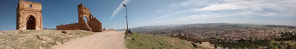 The hillsides around the tombs (mostly to the north and east) are still occupied by the sprawling Bab Guissa Cemetery (named after the nearby city gate, Bab Guissa),[11] though the graves visible today are likely much more recent. Today the site is well-known as a lookout with panoramic views over the old city of Fez, popular at sunset, and often mentioned in guidebooks and tourist literature.[12] In addition to the views, it is also a notable place to hear the call to prayer (adhan) broadcasting simultaneously from all the mosques in the old city.[13]