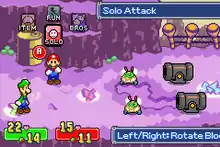 The gameplay of Mario & Luigi differs from most other role-playing games due to its focus on controlling Mario and Luigi simultaneously. During overworld sections, the directional pad controls Mario's movement with Luigi following closely, while Mario and Luigi's other actions are controlled individually with the A (Mario) and B (Luigi) buttons respectively.[5] The game begins with them being able to jump independently, though they would soon gain access to hammers and a variety of other techniques as the game progresses. For example, Luigi's hammer can be used to squash Mario into a smaller size, allowing the latter to access small gaps, while placing Mario on Luigi's shoulders allows them to act like a propeller and hover across large gaps.[6] Various enemies roam the overworld, and coming into contact with these enemies initiates a battle. Landing a hit on the enemy while on the overworld allows the player to deal pre-emptive damage, while the opposite is also possible.